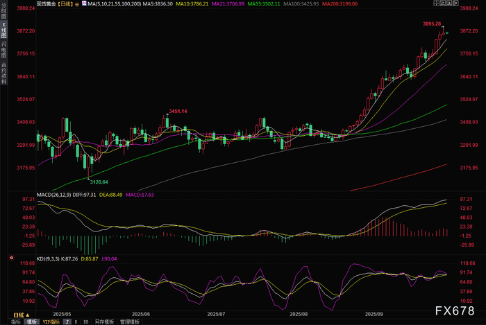 汇通财经APP讯——周四(10月2日)亚市早盘,现货黄金高位窄幅震荡,目前交投于3862美元/盎司附近。现货黄金周三盘中一度触及3895.28美元的纪录高位,最终收盘于每盎司3865.49美元,涨幅虽仅0.19%,但这已足够彰显其强劲势头,美元的走软、美国政府停摆引发的避险情绪,以及疲软就业数据强化美联储降息预期,这些元素共同构筑了黄金的上涨逻辑。